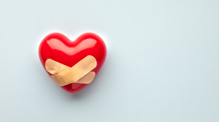 Heart with medical patch on grey background, top view. Relationship problems concept broken heart fix, Valentines Day, medical health concept cross with copy space top view