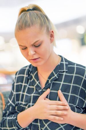 Young girl suffering from chest pain heart attack. Healthcare and medical concept. Portrait of a young woman with chest pain touching chest