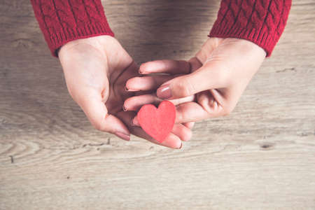 Red heart in woman hands on wooden background
