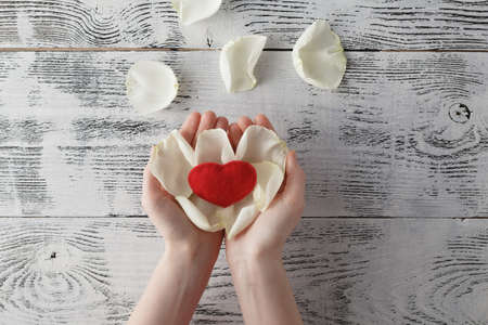 World Heart Care Day Background. White Rose petal in human hands. Top view