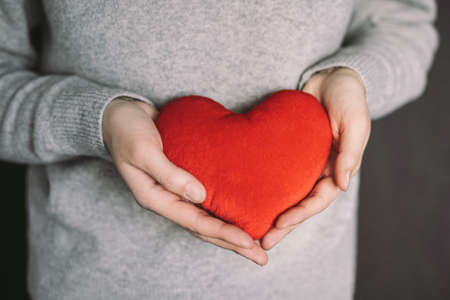 heart on hand for philanthropy concept / woman holding red heart in hands for valentines day or donate help give love warmth take care