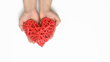 two female hands hold a red wicker heart on a white background, the concept of gratitude, kindness. Charity and organ donation, copy space