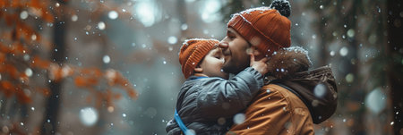 Happy father and his son having fun on a snowy winter day.