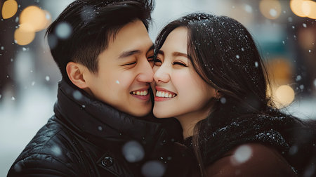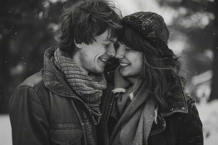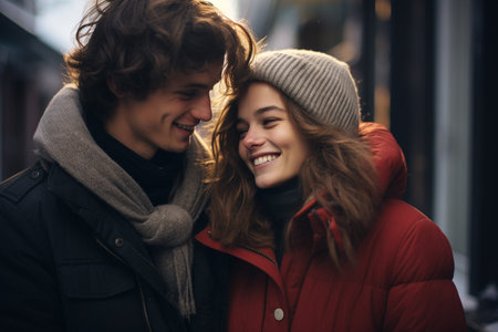 Young couple embracing in warm winter clothing, smiling and flirting generated by artificial intelligence