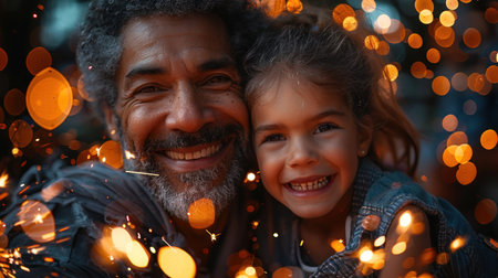 Generative AI : Fathers day Child girl hugging father in nature at sunset in summer