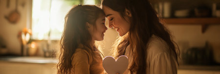 A joyful moment between a mother and daughter in a cozy kitchen, sharing a heart drawing, with natural decor creating a warm, loving atmosphere, banner