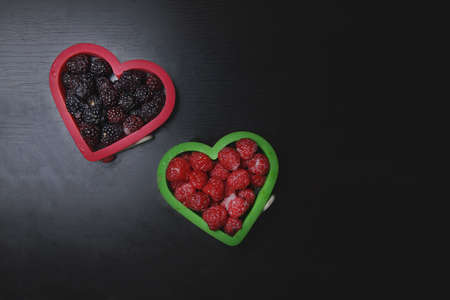 Ice cream for lovers. Berry ice cream in the shape of a heart on a dark background. The play of light focuses on objects,