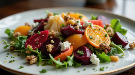 A vibrant salad featuring assorted beets, slices of citrus fruit, nuts, and creamy cheese served on a white plate. Natural lighting enhances the freshness of the ingredients.