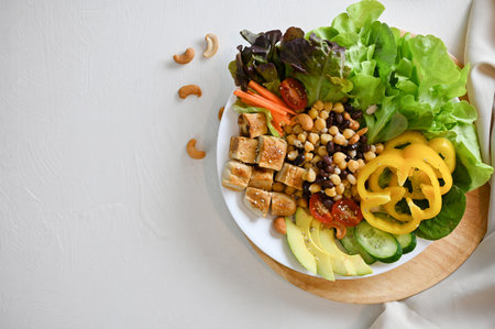 Buddha bowl healthy salad mixed on a white dining table, high nutrition and protein diet meal. Chickpea with grilled tofu and salad mixed. top view