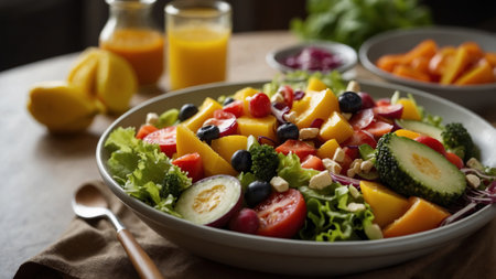 Freshly prepared salad with colorful vegetables and fruits served on a wooden table