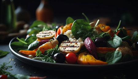 Healthy gourmet salad with grilled vegetables on a wooden plate generated by artificial intelligence