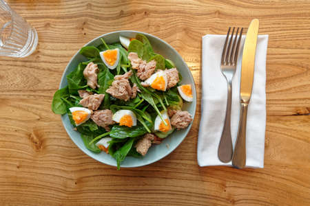 Tuna salad with eggs and vegetables on wooden table, closeup