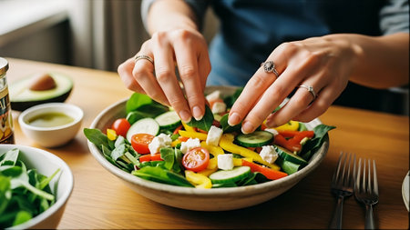 A close-up shot captures a person's hands as they mix a colorful salad in a bowl, featuring crisp greens, red tomatoes, green cucumbers, and crumbled feta cheese, all set on a light-colored tableclot.