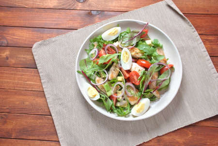 Chicken salad with avocado and cherry tomatoes, arugula and beet leaves. Healthy lunch bowl with vegetables and chicken on a wooden background. Healthy food concept