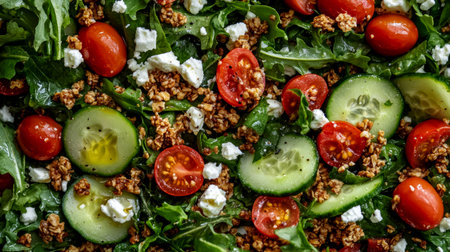 Fresh mixed greens are topped with juicy cherry tomatoes, crunchy cucumbers, and a sprinkle of granola for a nutritious meal.