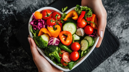 Nutritionist's hand holding a heart-shaped dish filled with colorful, fresh vegetables. -