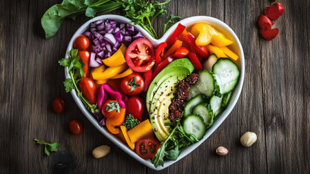 A heart-shaped dish overflowing with fresh vegetables, showcasing vibrant colors and healthy ingredients ideal for a love-themed culinary adventure.