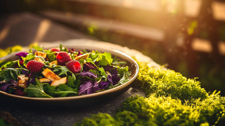 Fresh organic salad in bowl with greens, warm golden hour light, soft evening glow, styled on mossy ground cover.