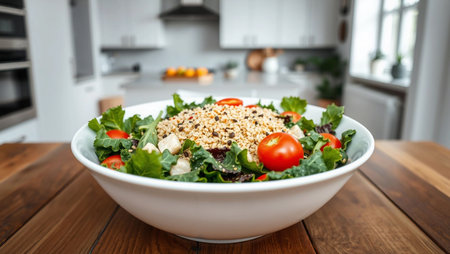 Healthy salad with quinoa, tomatoes and lettuce on a wooden table