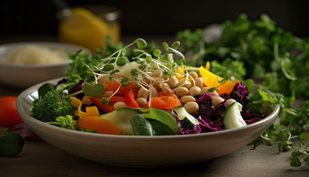A close-up shot of a vibrant salad brimming with various vegetables, microgreens, and beans. A healthy and delicious meal.