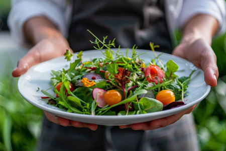 Chef presenting a colorful and healthy salad with fresh ingredients and edible flowers, emphasizing the beauty of natural food