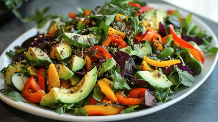 A vibrant vegetarian salad with colorful vegetables, avocado, and seeds, drizzled with a light dressing.