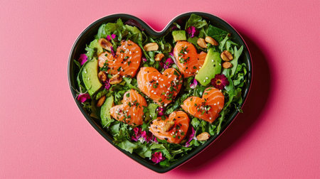 A vibrant heart-shaped salad featuring salmon and avocado on a pink background, perfect for romantic meals or healthy dining experiences.