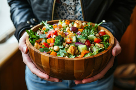 A person holding a wooden bowl with fresh salad in hands, healthy organic food concept