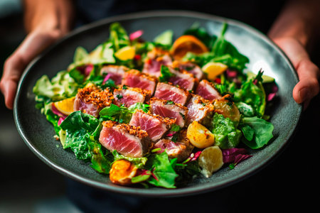 A vibrant salad features succulent slices of seared tuna on a bed of mixed greens, garnished with citrus segments and a drizzle of dressing, a perfect dish in a trendy dining setting.