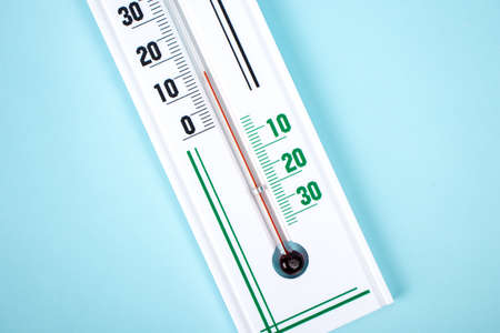 Thermometer for measuring temperature indoors and outdoors isolated on a blue background.Weather concept
