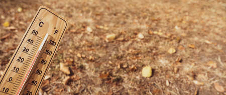 Wooden thermometer with red measuring liquid showing high temperatures over 36 degrees Celsius on sunny day on background of dry lawn. Concept of heat wave, warm weather, global warming, climate.