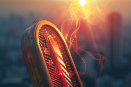 A thermometer shows elevated temperature levels as the sun sets, casting a warm glow over the landscape and indicating a hot day.