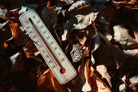 Close-up photo of household alcohol thermometer in maple leaves showing temperature in degrees Celsius. Outdoors. Close-up, selective focus