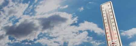 Wooden thermometer showing high temperature over 42 degrees Celsius on hell hot day before the storm. Blue sky background. Panorama. Concept of heat wave, warm weather, global warming, climate change.
