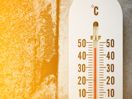 Closeup thermometer showing temperature in degrees Celsius, Hot temperature