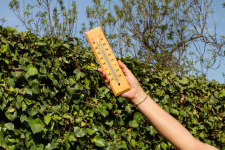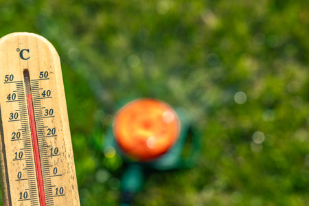 Measuring the temperature at high noon in the garden, a wooden thermometer shows a high temperature, a dangerous temperature for the grass