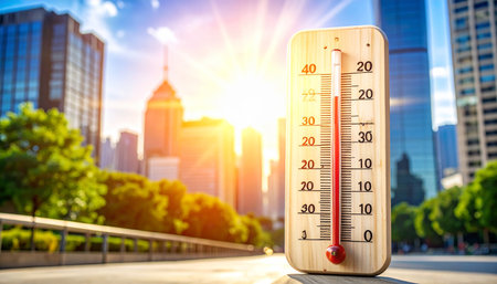 A thermometer displaying the temperature against the backdrop of a bustling city skyline, Thermometer with high temperature in the city with a glowing sun background