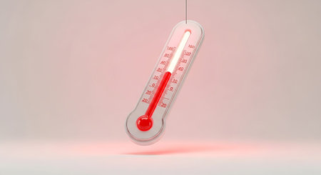 a single thermometer suspended in the air, tilted slightly. A bright red liquid column indicates a temperature. The thermometer is surrounded by a warm, red ambient glow, suggesting intense heat or a feverish state. The clean, white background provides a stark contrast, attention to the instrument and its reading. The focus is on the visual representation of elevated temperature.