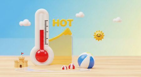 A whimsical beach scene a large thermometer displaying a temperature, with the red liquid near the A small sandcastle with a flag sits to the left, and a blue and white striped beach ball is in the foreground. Two miniature red and white striped balls are also present. A stylized sun with a happy face shines in the sky, and a yellow graph with an upward trend is visible behind the thermometer. The scene suggests a very hot summer day at the beach.