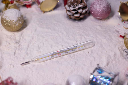 medical thermometer next to New Years decorations in the snow. Christmas trees, balls, snowflakes, gifts, cones. Christmas mood. Flatly photo.