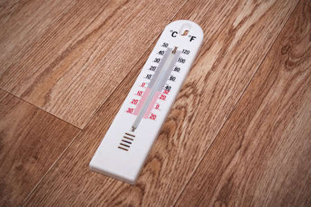 Closeup photo of household alcohol thermometer showing temperature in degrees Celsius