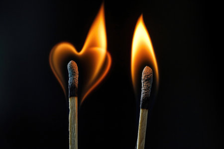 Brightly burning match head glowing in contrast to dark background, representing passion, light, and intensity