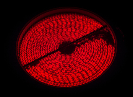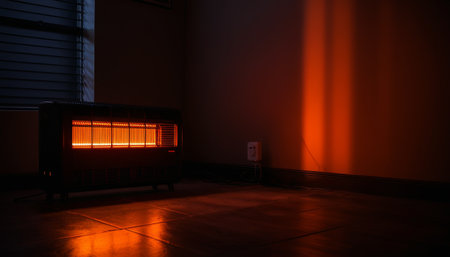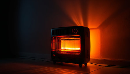 Electric heater glowing orange in a dark room, casting warm shadows on the walls