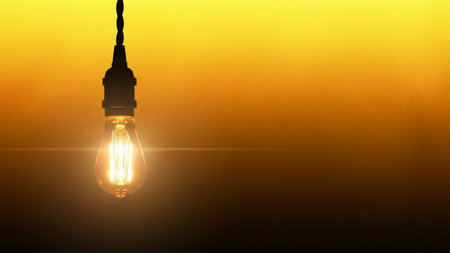 A single vintage incandescent light bulb hangs suspended against a warm yellow to dark orange gradient background. The filament inside the bulb is brightly illuminated, casting a soft glow and creating a lens flare effect. The has a clean, minimalist aesthetic, focusing on the and its light. The warm colors and the classic of the bulb evoke feelings of nostalgia, inspiration, and energy.