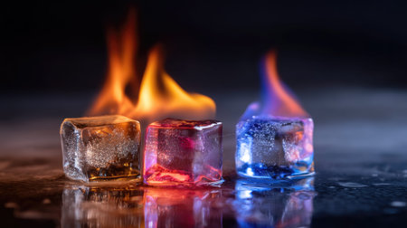 This captivating image showcases colorful ice cubes ablaze with flames against a dark background, creating a striking contrast of elements.