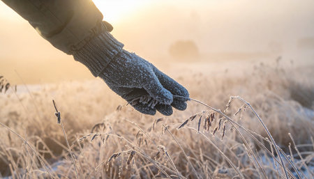 Hand in a frosted glove touching a frozen plant stem in a misty field at sunrise Clear details and vibrant co...