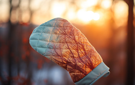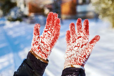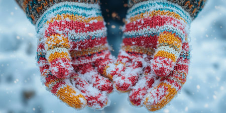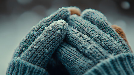 Close-up of knitted woolen gloves dusted with frost, evoking warmth and coziness in a chilly, snowy setting.