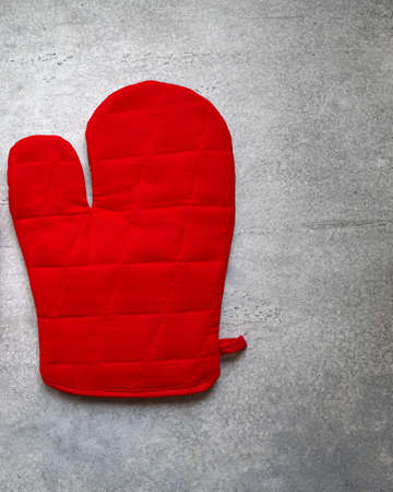 Red glove oven mitt for trays and pans, gray concrete background, close-up