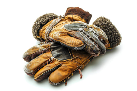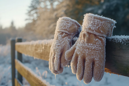 Gloves adorned with frost are placed on a wooden fence in a serene winter setting, showcasing the chill of the season and the tranquility of nature's beauty