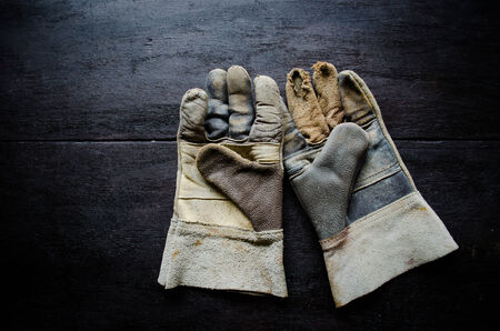 Torn work gloves lying on a pile of firewood, with splinters and dust scattered around